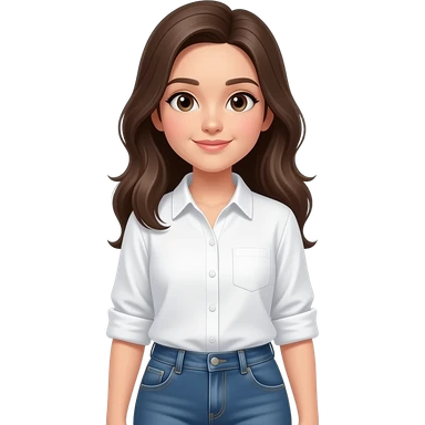 girl with long layered hair hazelnut brown hair, dark green eyes and freckles standing wearing a white tank top and light blue denim jeans emoji