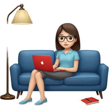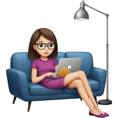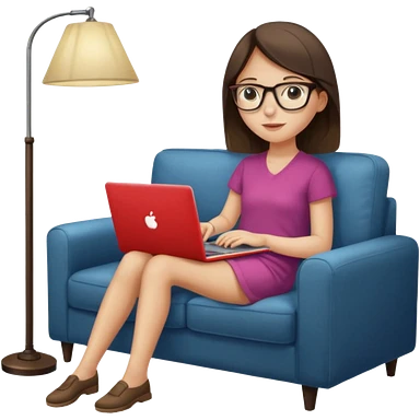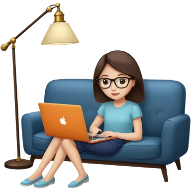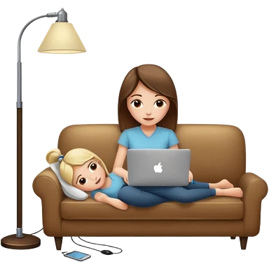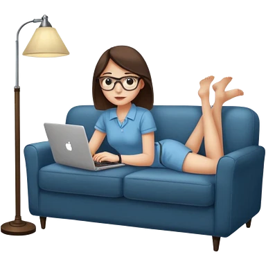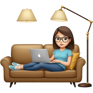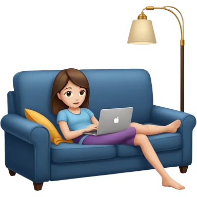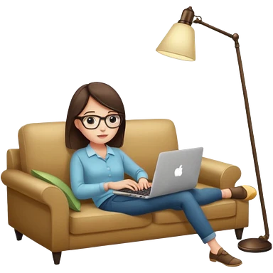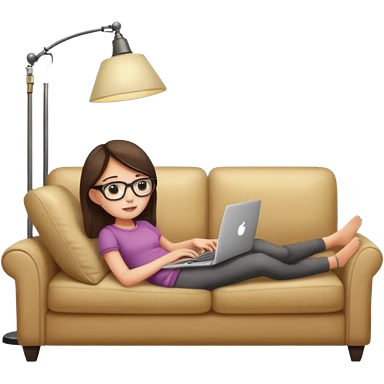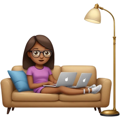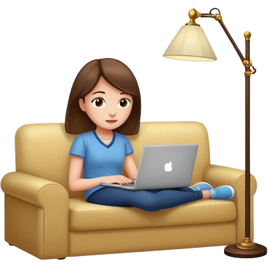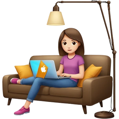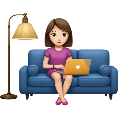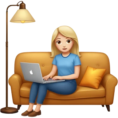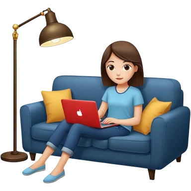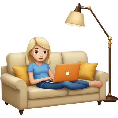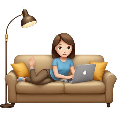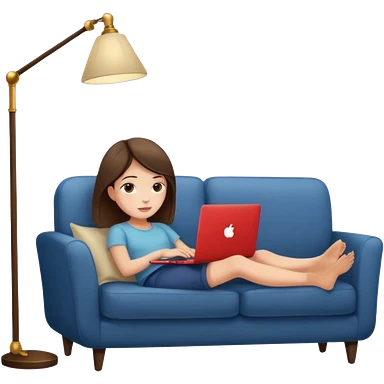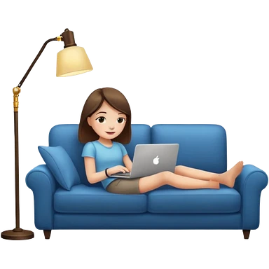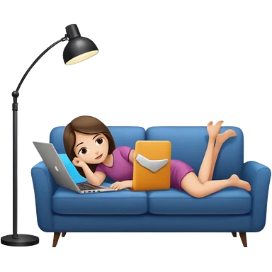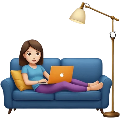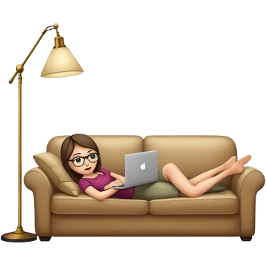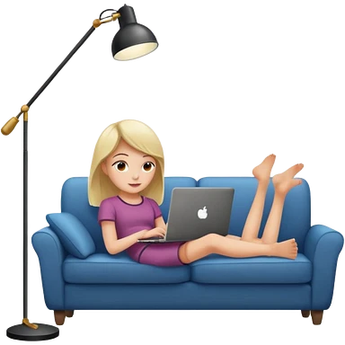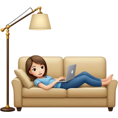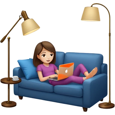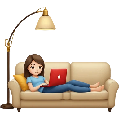 A girl is working with a laptop while lying on a sofa, with a floor lamp to the right. emoji | AI Emoji Generator