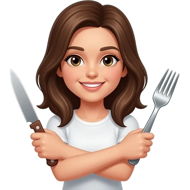 a girl with brown hair holding knofe on left arm and fork in right arm emoji