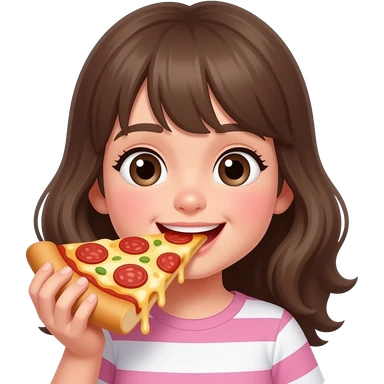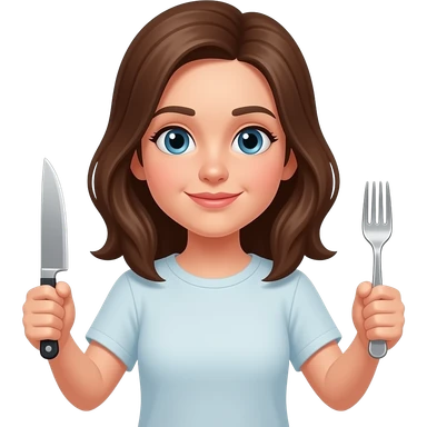 a girl with long brown hair and brown eyes holding knofe on left arm and fork in right arm waiting food emoji