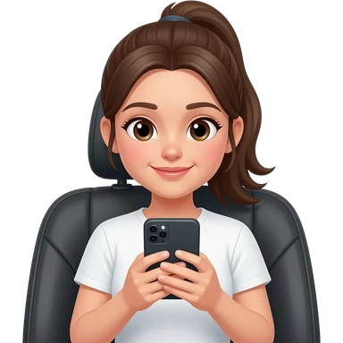 A girl with a pony tail, white t shirt looking at her phone in the car emoji