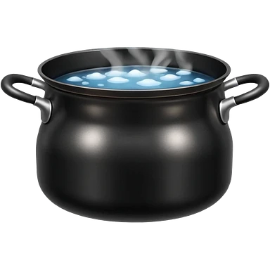 black small metal pot filled with boiling water on a stove, visible hot steam and rising bubbles, realistic heat effect, shiny pot surface, bright lighting, clean white background emoji