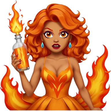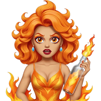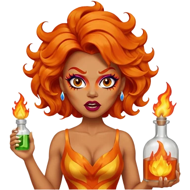 A fierce drag queen emoji with bright orange wavy hair styled with a bottle on top, dramatic makeup, expressive angry face, and an orange flame-themed dress. emoji