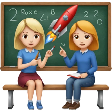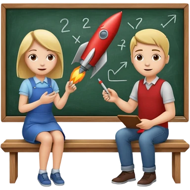 Girl is teaching a guy how to make rocket emojis. Girl at blackboard, guy on bench learning. emoji