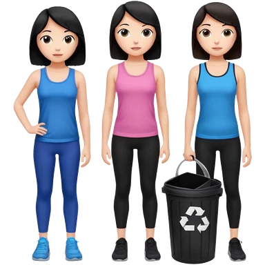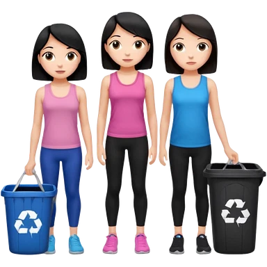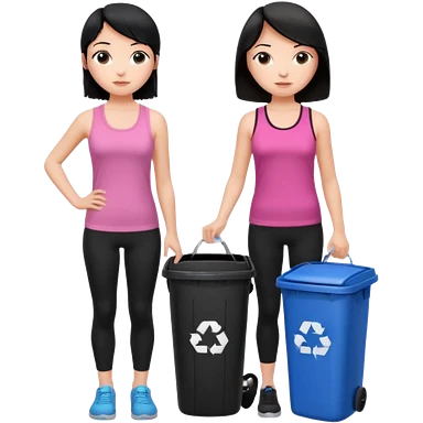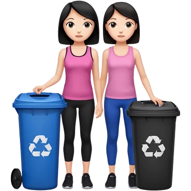 generate a genmoji of a black haired girl in a pink tank top and black leggings holding a black trash bag. Standing with her is a brunette girl in a similar blue tank top and black leggings. Standing in front of a dustbin emoji