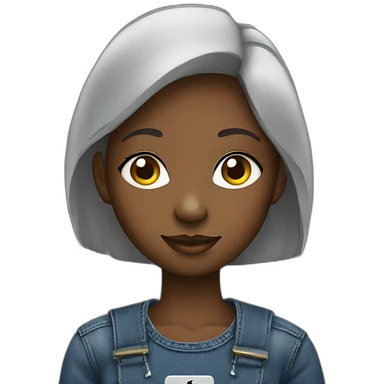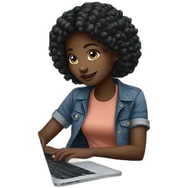 a young african girl with black wavey hair using her macbook to code on her table and where a denim top emoji