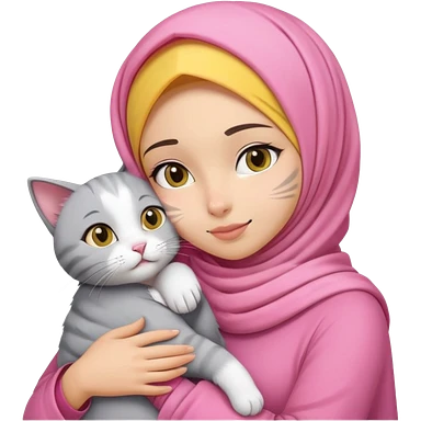 girl wear a pink hijab, the skin is yellow complexion, and hug a cat that has a gray shaped like a gordyn in face and white fur emoji