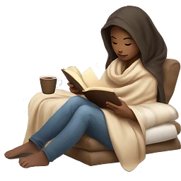 White Girl relaxed reading a book under a blanket with coffee in her hands emoji