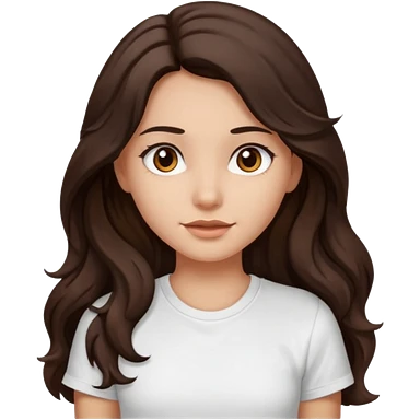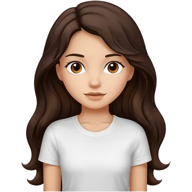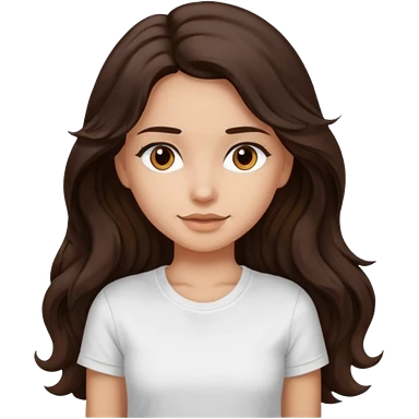 iOS style emoji. A girl with very long dark brown wavy hair. And the eyes color is dark brown. And she is wearing white t shirt emoji
