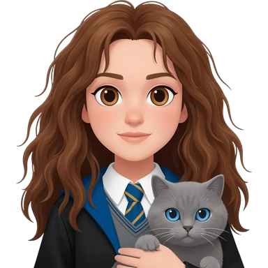 ravenclaw girl student with long brown messy hair and brown eyes, holding a gray cat with blue eyes emoji