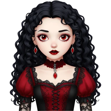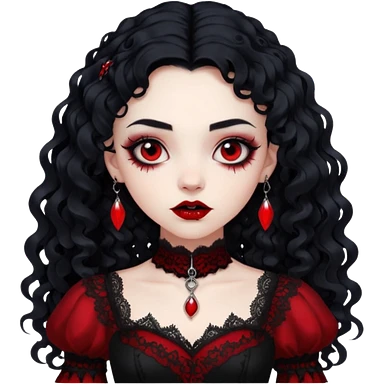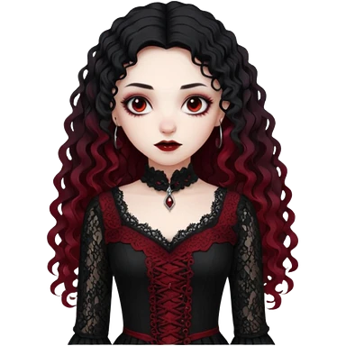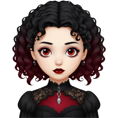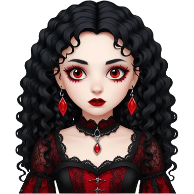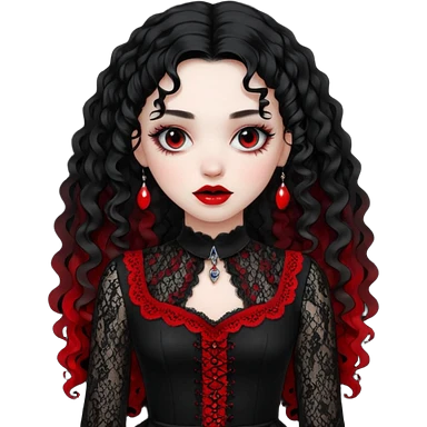 A girl with a red goth vampire look in a black and red goth lace dress with long sleeves and long black curly hair Fox eyes emoji | AI Emoji Generator