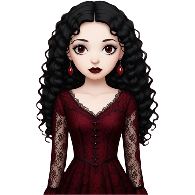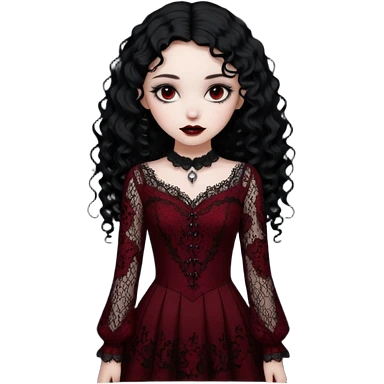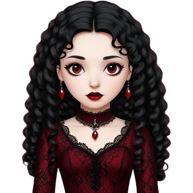 A girl with a dark red goth vampire look in a goth lace dress with long sleeves longer black curly hair emoji