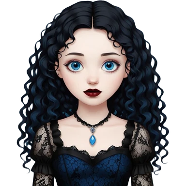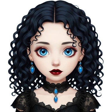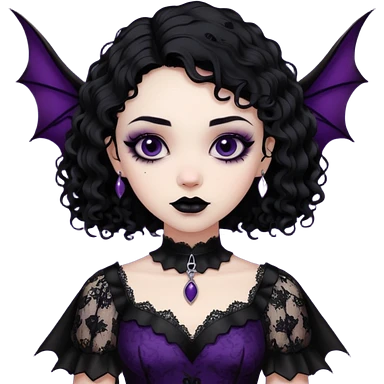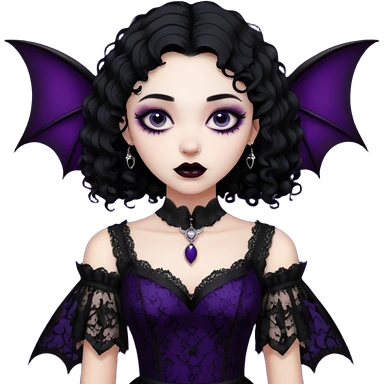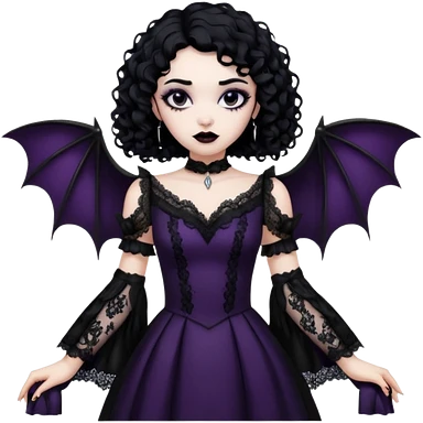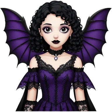 A girl with a goth vampire look in a goth lace batwings shaped sleeves dress black curly hair emoji
