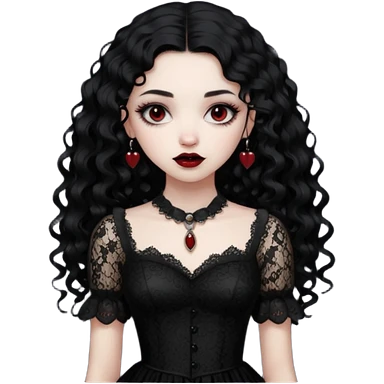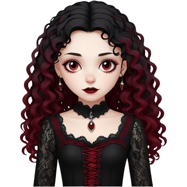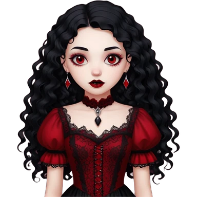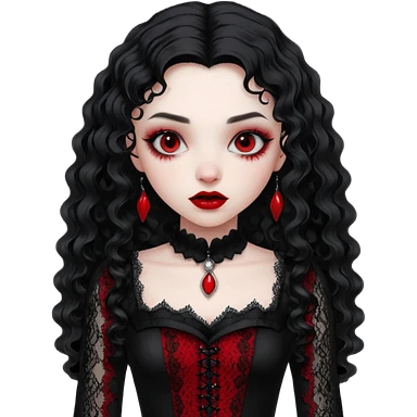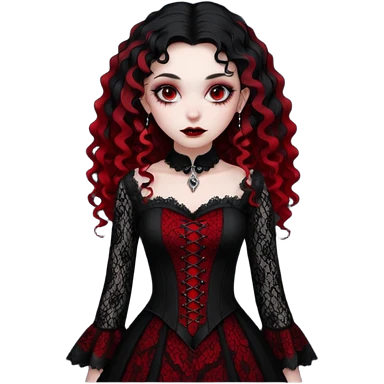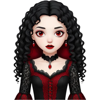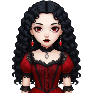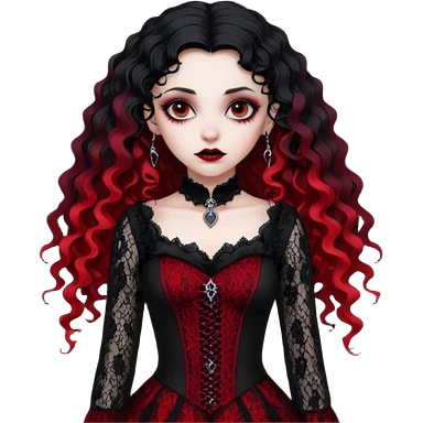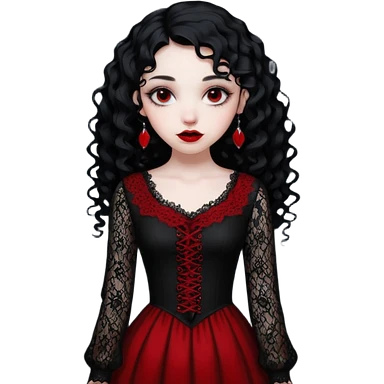 A girl with a red goth vampire look in a blck and red goth lace dress long black curly hair emoji