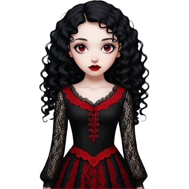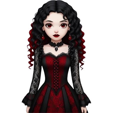 A girl with a red goth vampire look in a black and red goth lace dress with long sleeves and long black curly hair emoji