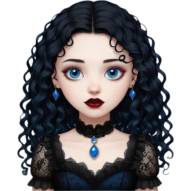 A girl with a dark red goth vampire look in a black goth lace dress with long sleeves longer black curly hair emoji