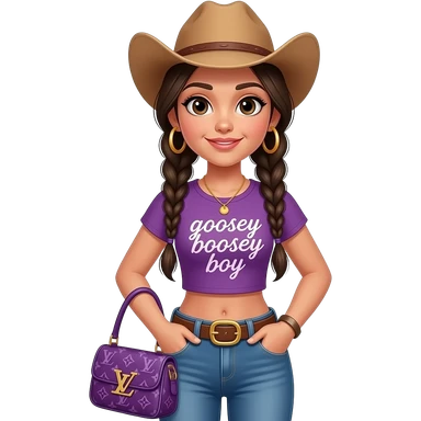 Black 13-year-old girl with BoHo braids, sassy with a purple Louis Vuitton bag a crop top that says goosey boosey boy 🏇big hoop earrings that are gold and cute jeans that are tight both hands in pockets with a rodeo, cowboy hat, realistic, hyper realistic emoji