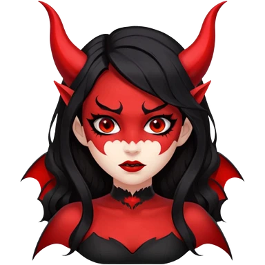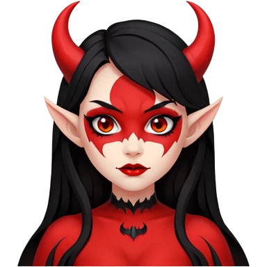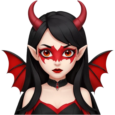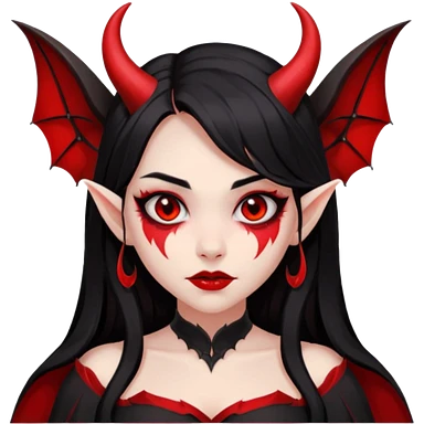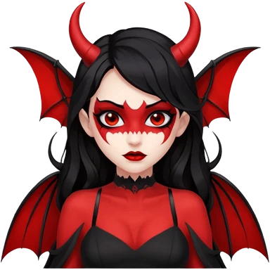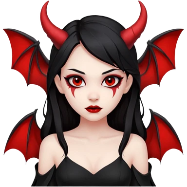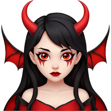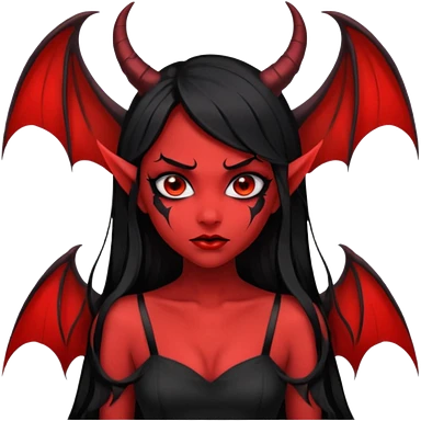 demon girl, skin red , black long hair, small horns, bat wing, black open-back dress, bold black outlines, red+black palette emoji