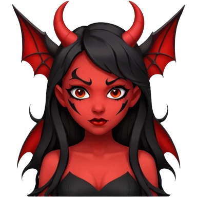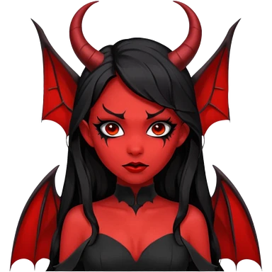 demon girl, skin red , black long hair, small horns, bat wing, black open-back dress, bold black outlines emoji