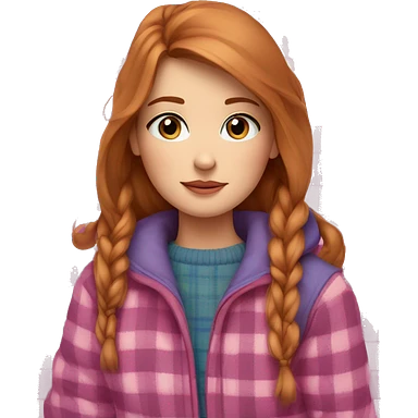 a girl with light reddish brown hair and blue eyes lies under a winter pink plaid emoji