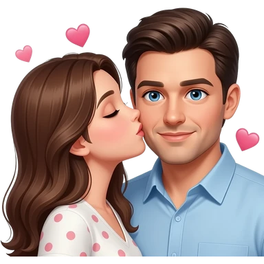 A realistic girl with brown long hair kissing a realistic man with dark brown hair and blue eyes with hearts emoji