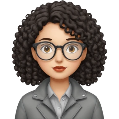 A girl in Black coat with glasses with gray-blue eyes, white skin and curly black hair and aristocratic high cheekbone emoji