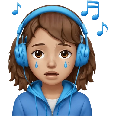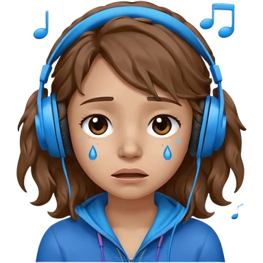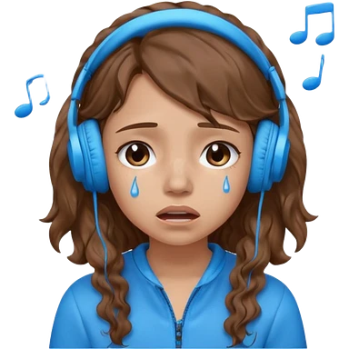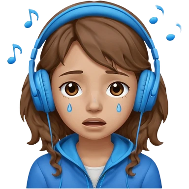 A crying girl with wavy hair listening to music with blue headphones emoji