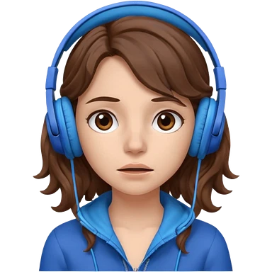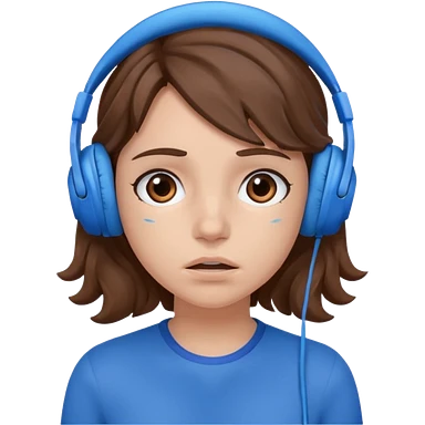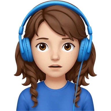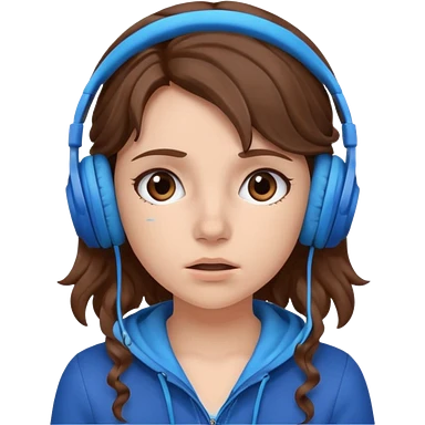 An upset girl with wavy hair listening to music with blue headphones emoji
