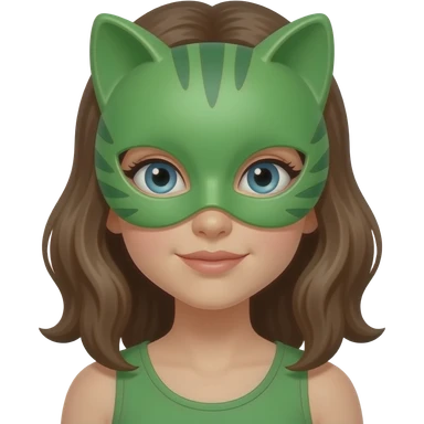 A girl with dark blonde hair and blue green ish eyes with a green cat mask on emoji