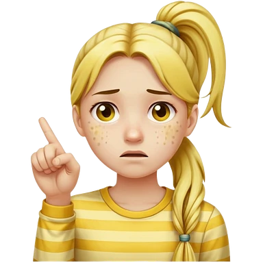 make a memoji of a girl with long ponytail, yellow striped shirt, with face full of pimples acting sad while pointing at its face emoji