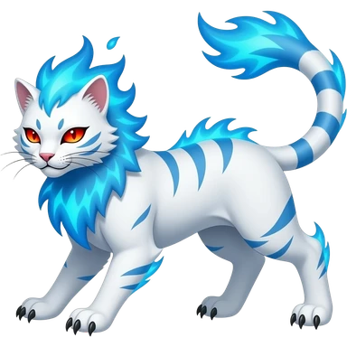 A sleek white feline with a mane of living blue fire, long claws, blue lava spikes on its back, blue lava stripes, and red flaming eyes that glow in darkness. It is proud, fast, and fiercely territorial. emoji
