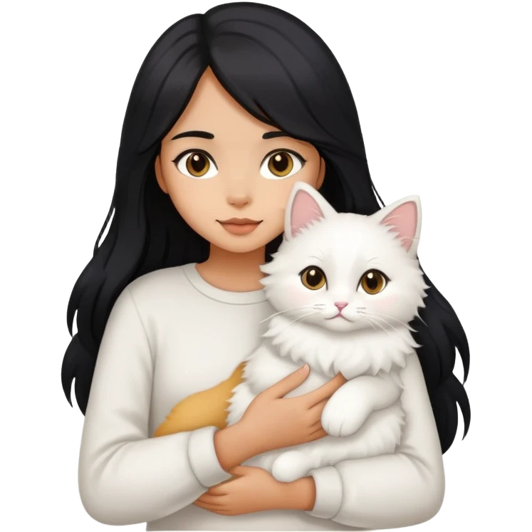 Emoji girl with beautiful makeup, light skin, long black hair, holding and cuddling a white fluffy cat emoji