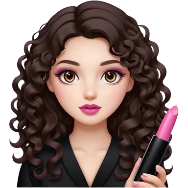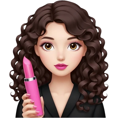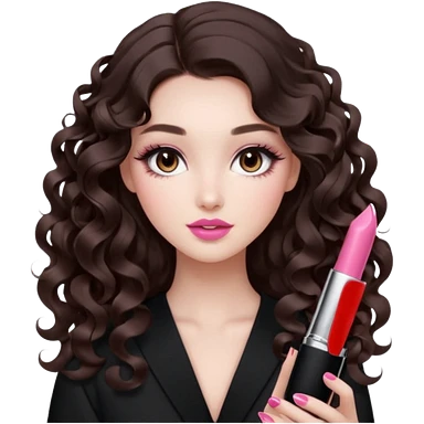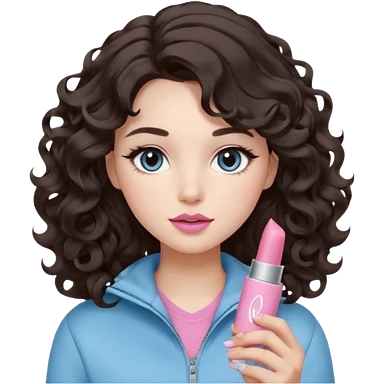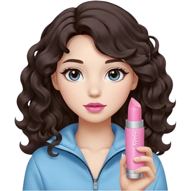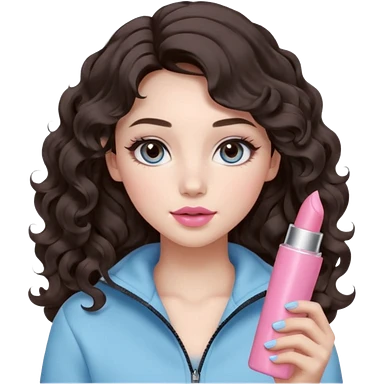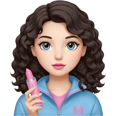 A girl with long dark brown hair styled in loose 36mm curls, round-almond Douyin-style eyes with long curled lashes, cool-tone neutral makeup. She’s wearing a light-blue athletic outfit and holding a normal-size pink lipstick (not oversized) in one hand.emoji