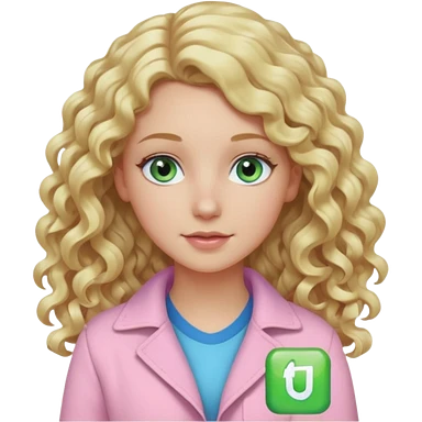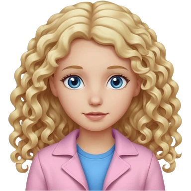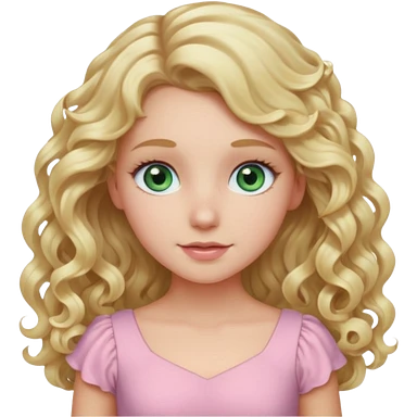 Blonde girl with dirty blonde curly long hair in a pink long sleeve shirt with green eyes make her lil chubby portrait emoji