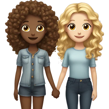 Girl with curly brown hair and lashes and a blonde girl with long hair holding hands emoji