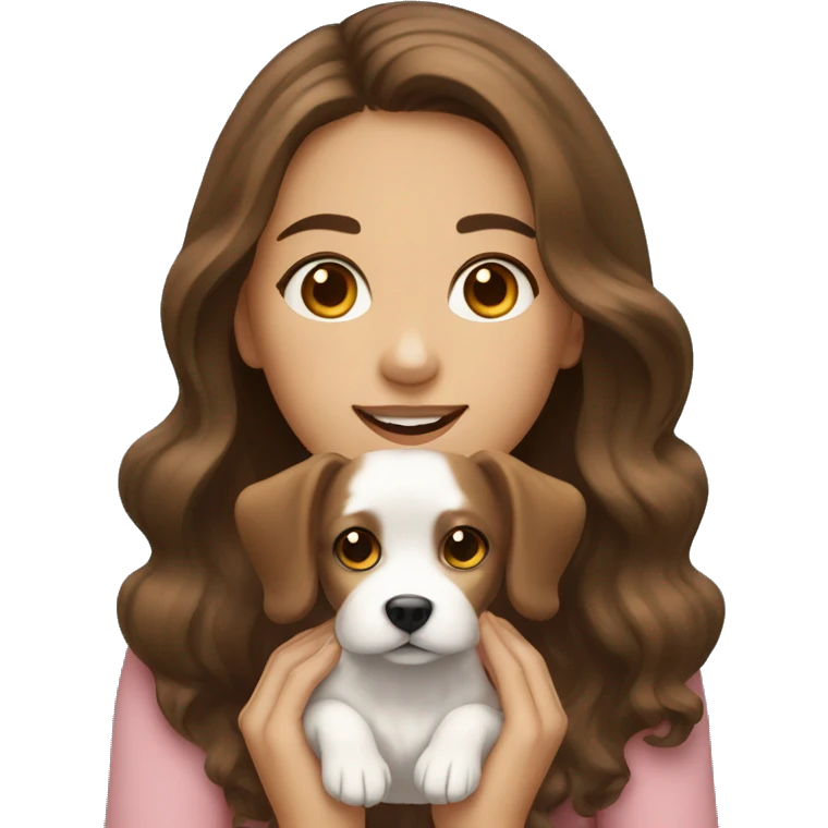 A girl with long wavy brown hair and brown eyes holds a small white dog. emoji | AI Emoji Generator