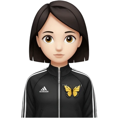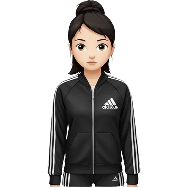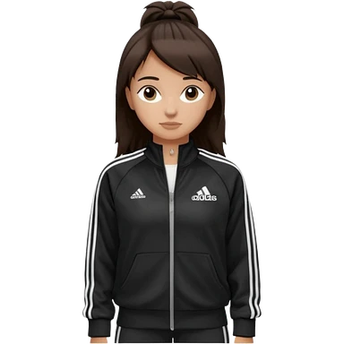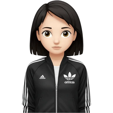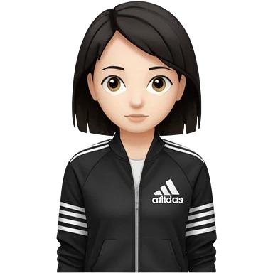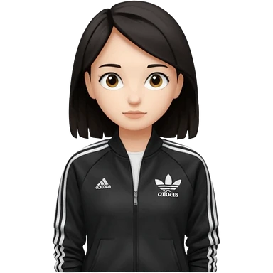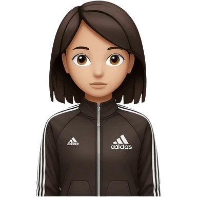 A girl with medium-length, dark hair, fair skin. The style is a soft, layered cut that falls around her shoulders. wore black Adidas track jacket with white stripes on the sleeves. It has a full zipper down the front, a stand-up collar, and the Adidas logo on the right chest emoji emoji | AI Emoji Generator