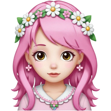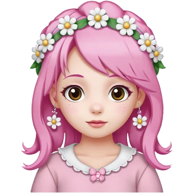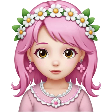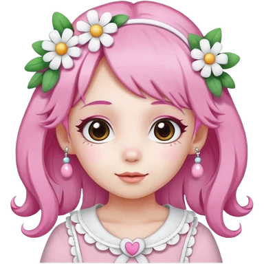 A girl with pink and white hair, adorned with flowers as hair accessories, wearing My Melody clothing.Let the girl be older emoji | AI Emoji Generator