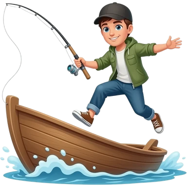 a guy flying off a boat with a fishing rod emoji