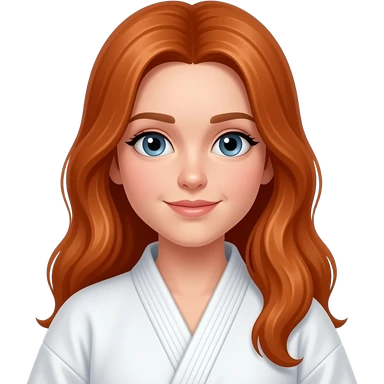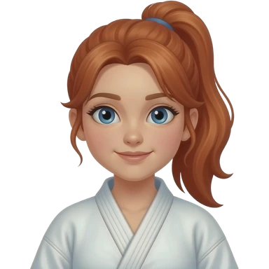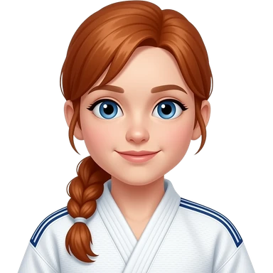 a girl with long red hair in a ponytail, 13 years old with a judopak with blue eyes emoji