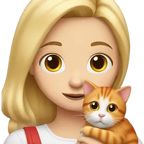 A girl with dark hair holds a ginger cat in her arms, they are smiling emoji
