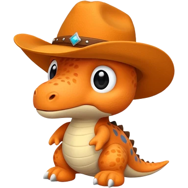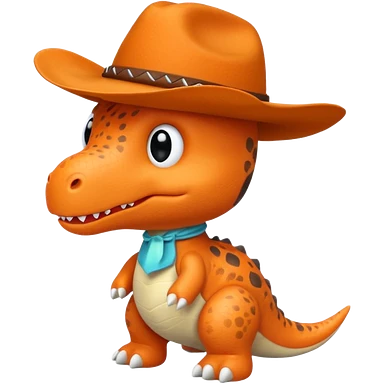 A emoji of a small dino plushie that's orange with a cowboy hat emoji