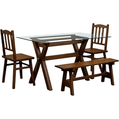 A glass topped rectangular trestle table with a high-backed chair on each short side and a bench on each long sided emoji