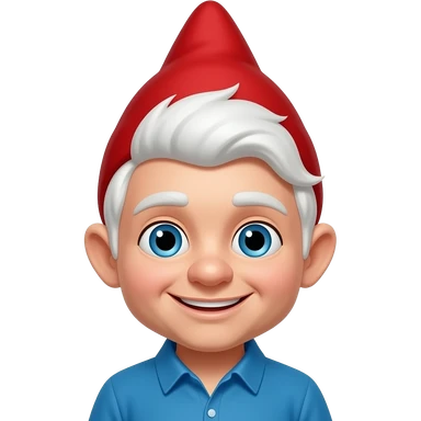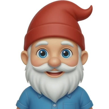 A smiling Gnome with a white beard , blue eye, blue shirt and a red pointed hair emoji