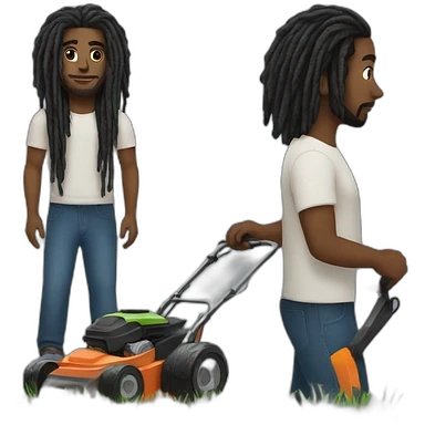 Black man with dreads in ponytail is mowing lawn it a push lawn mower emoji