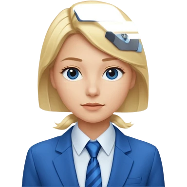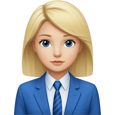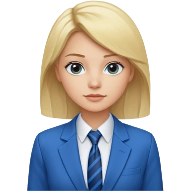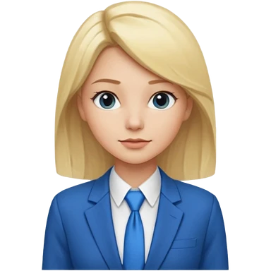 une femme blonde jolie avec une chemise blanche et une veste a manche longues et cravate bleu emoji