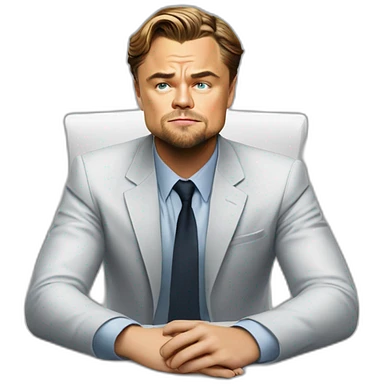 Leonardo DiCaprio sitting on the white table and trying to solve a problem in his business emoji