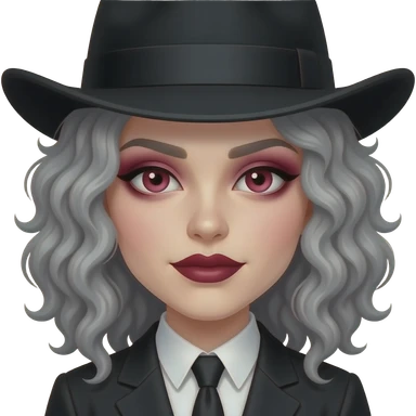 goth in curly grey hairs wear a hat and vibrant mehroon eye shadow and lipstick emoji