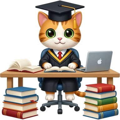 a graduate cat with books and a laptop emoji
