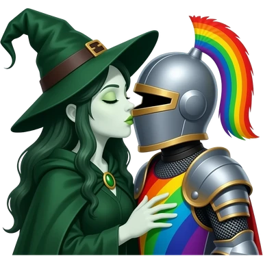 A green cloaked witch with pale skin kissing a rainbow knight without a helmet emoji | AI Emoji Generator